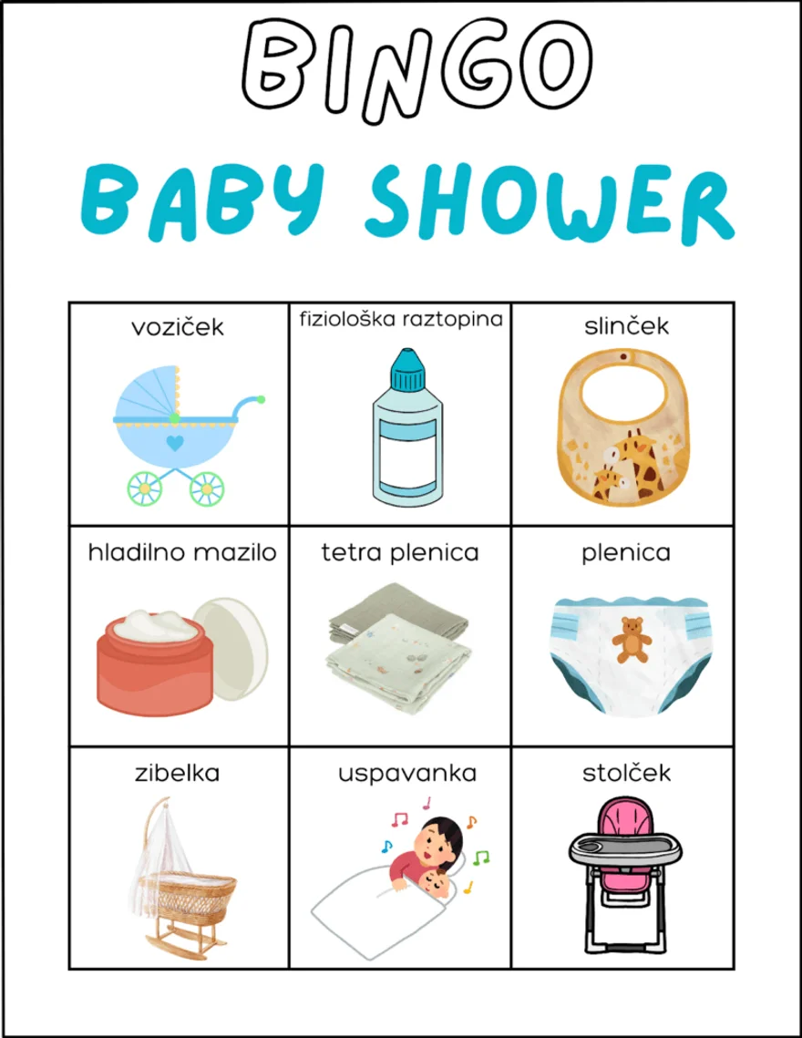 Vsaki gostji dajte eno bingo kartico in pisalo oziroma žeton. Vodja nato iz vrečke izreba lističe, na katerih so stvari, povezane z dojenčkom. Prva, ki pokrije vse kvadratke, zmaga.